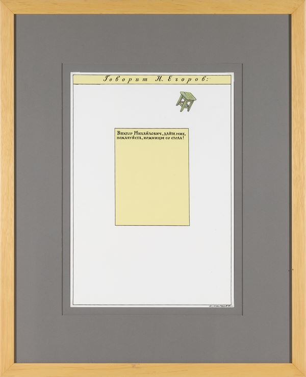 Zegt M. Egorov: “Viktor Mikhaïlowitsch, geef me eens de schaar van op de tafel a.u.b.” (Commentary drawing), 1991-92
