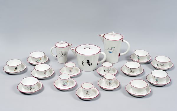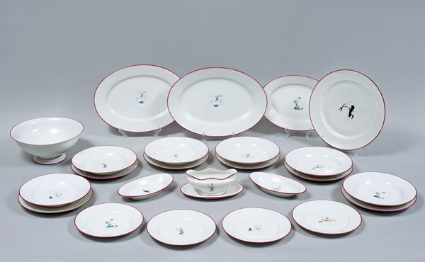11 piatti fondi, 29 piatti piani, 12 piatti da dolce, 3 ovali da portata, 2 piatti ovali piccoli, 1 salsiera, 1 insalatiera, 1 piatto grande dolci, 9 tazze con piattini, 5 tazzine con piattini,8 piattini spaiati
