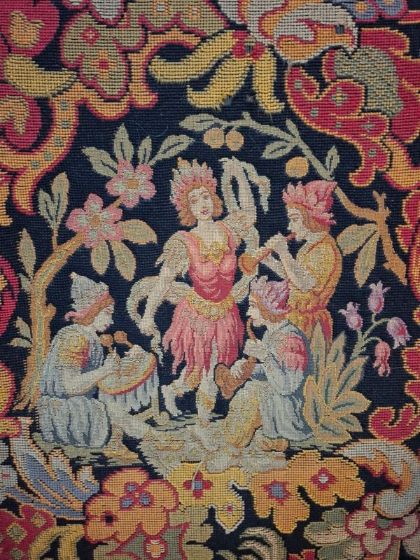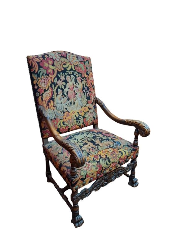 montanti a rocchetto in legno di noce, ricchi decori scolpiti a motivi naturalistici; schienale sagomato, rivestimenti in tessuto ricamato