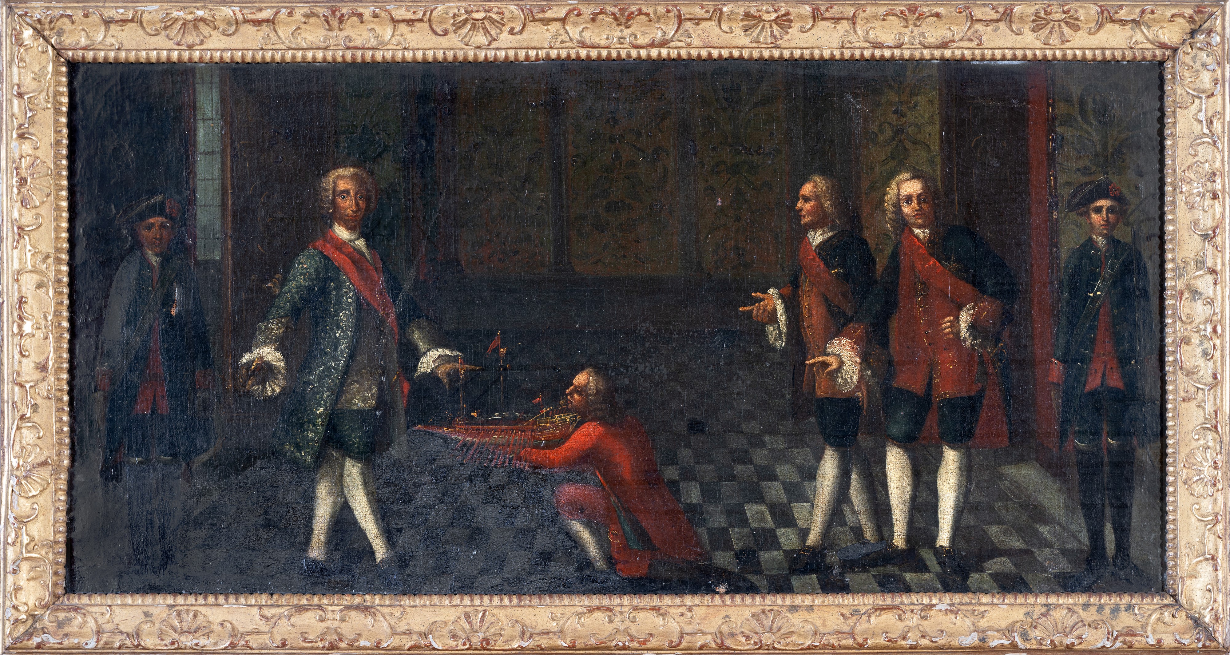 The painting depicts an official scene set in the halls of the Royal Palace of Naples, where Charles of Bourbon, recently enthroned, is presented with a model of a Royal Galley by two high-ranking court dignitaries in the first half of the 18th century. In the newly independent Neapolitan Kingdom, after centuries of viceroyalty, the reorganization of the royal fleet became the primary commitment to the new guidelines for mercantile expansion.