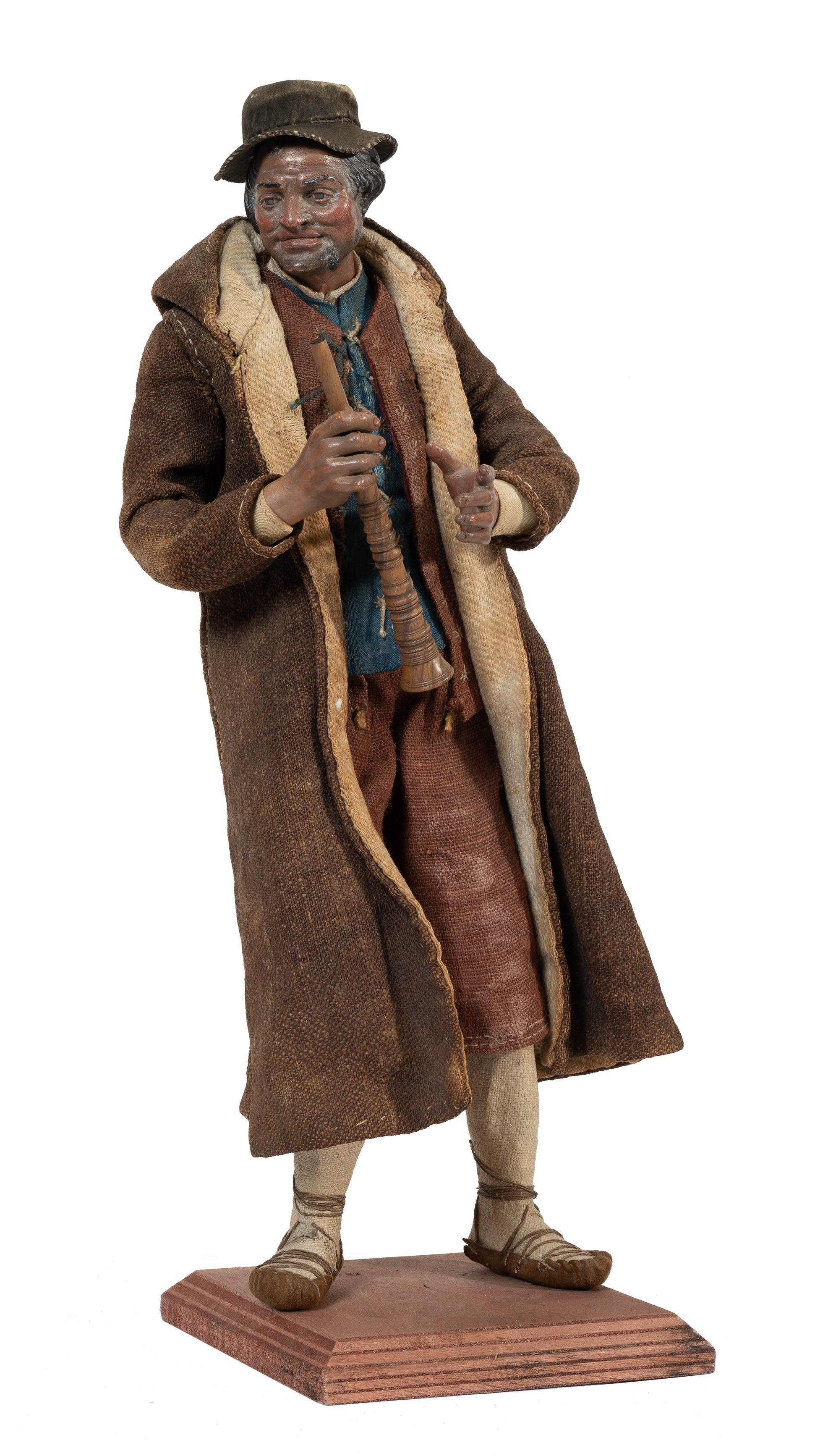 Head and limbs in terracotta and painted wood, dressed in a long canvas coat with hood, blue shirt, canvas waistcoat, brown trousers and ciocie