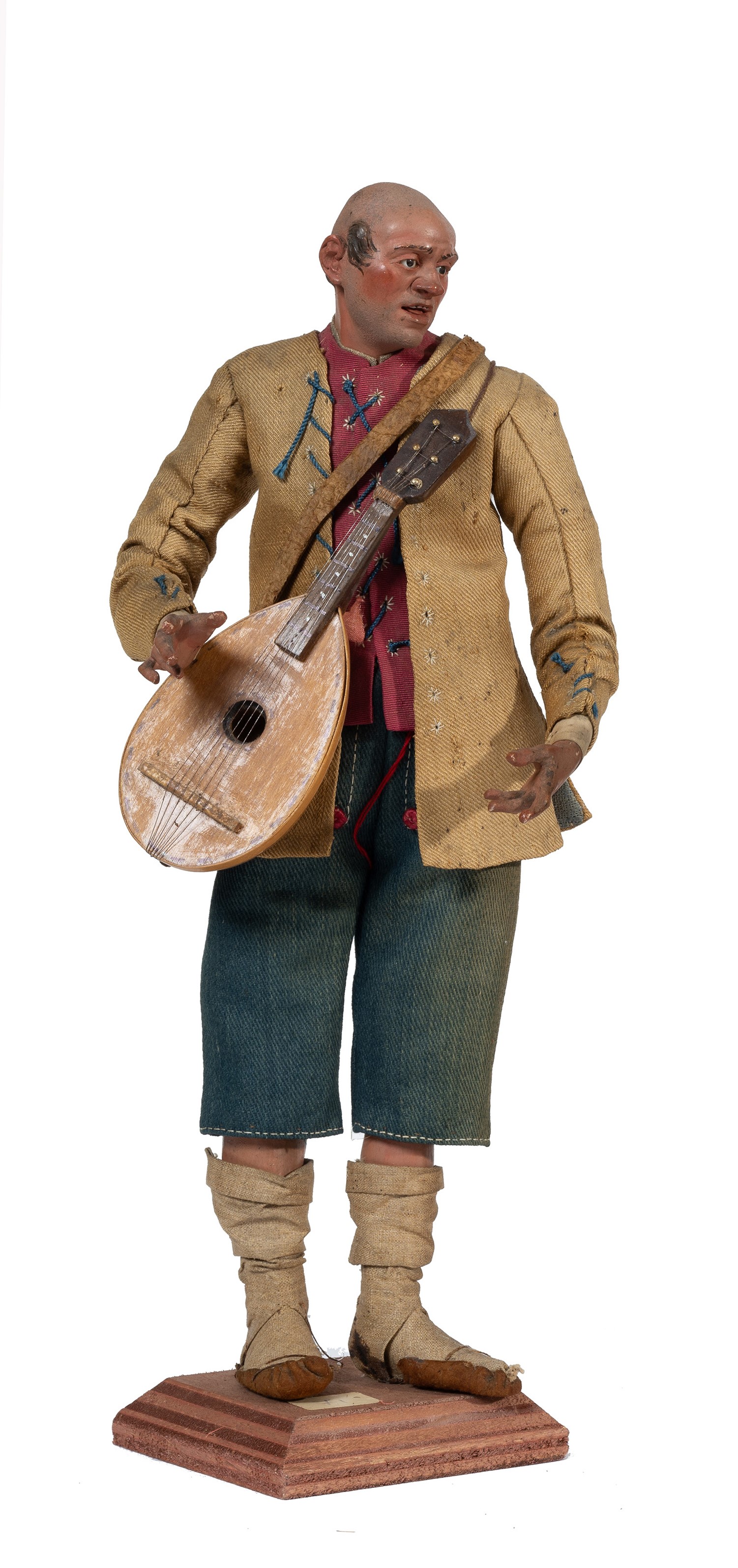 Giacca ocra, panciotto rosso, braghe blu e ciocie