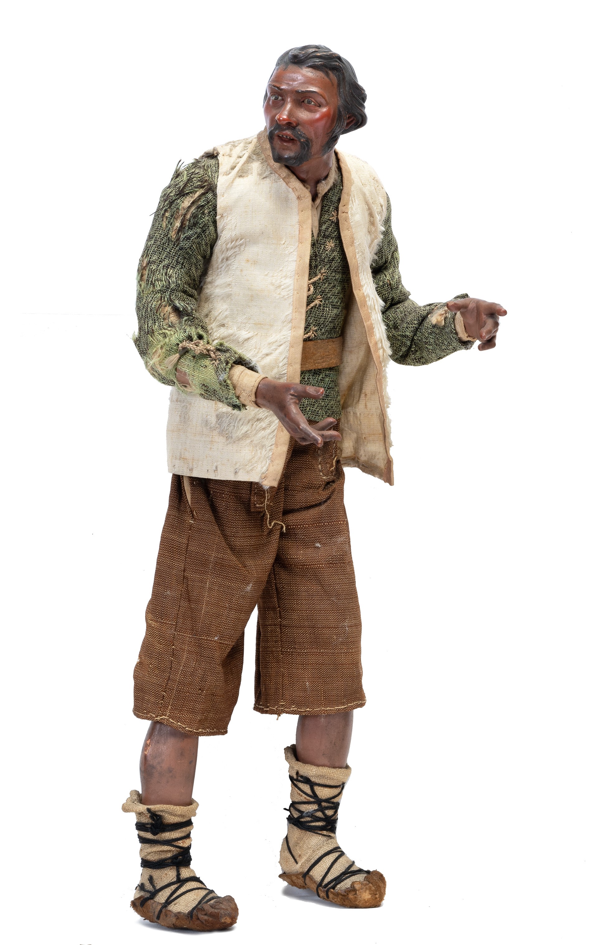 Painted wooden and terracotta head and limbs, dressed in a worn green jacket, fur vest, brown jute trousers, ciocie