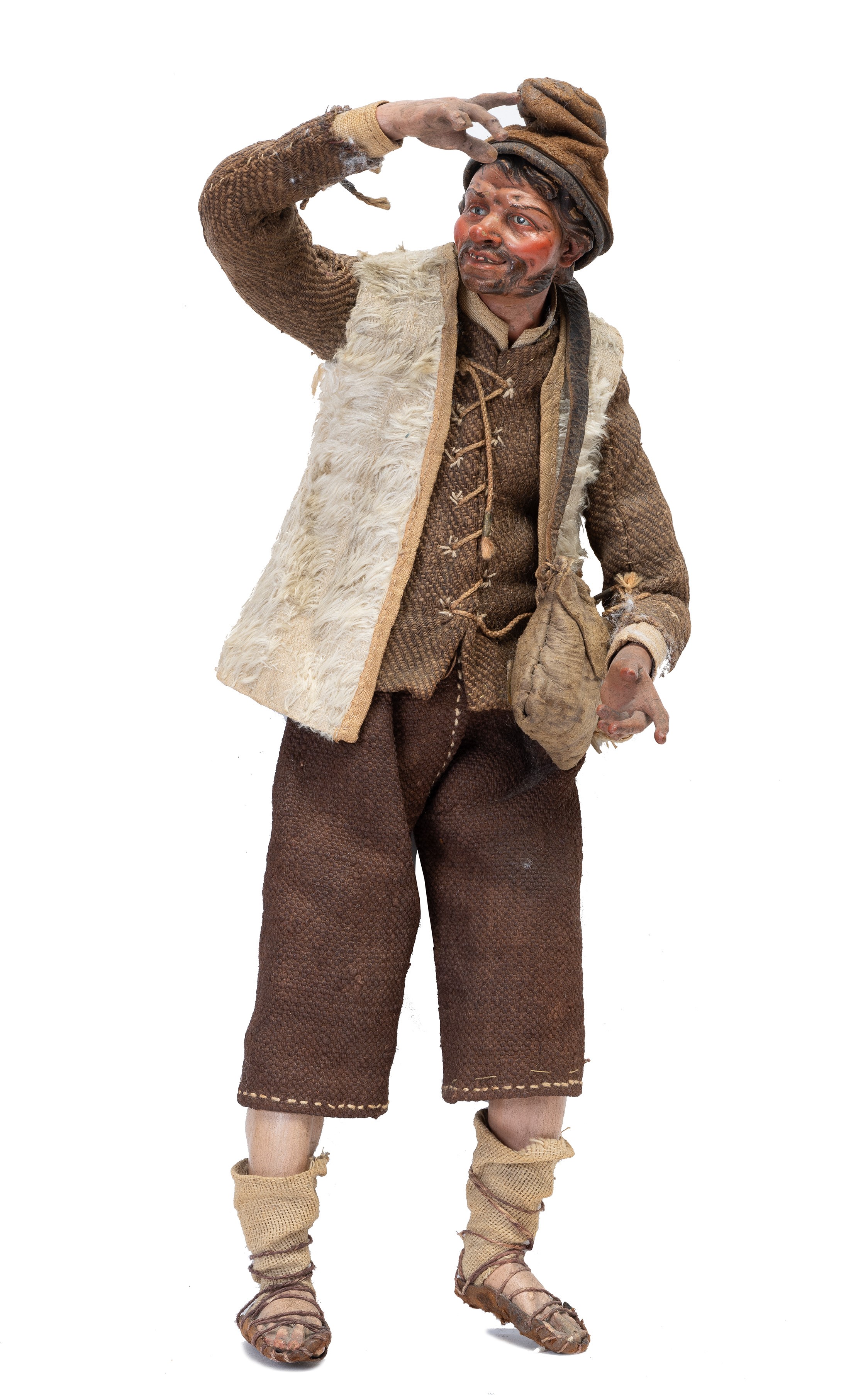 Head and limbs in terracotta and painted wood, dressed in a fur vest, jute jacket and shod with ciocie