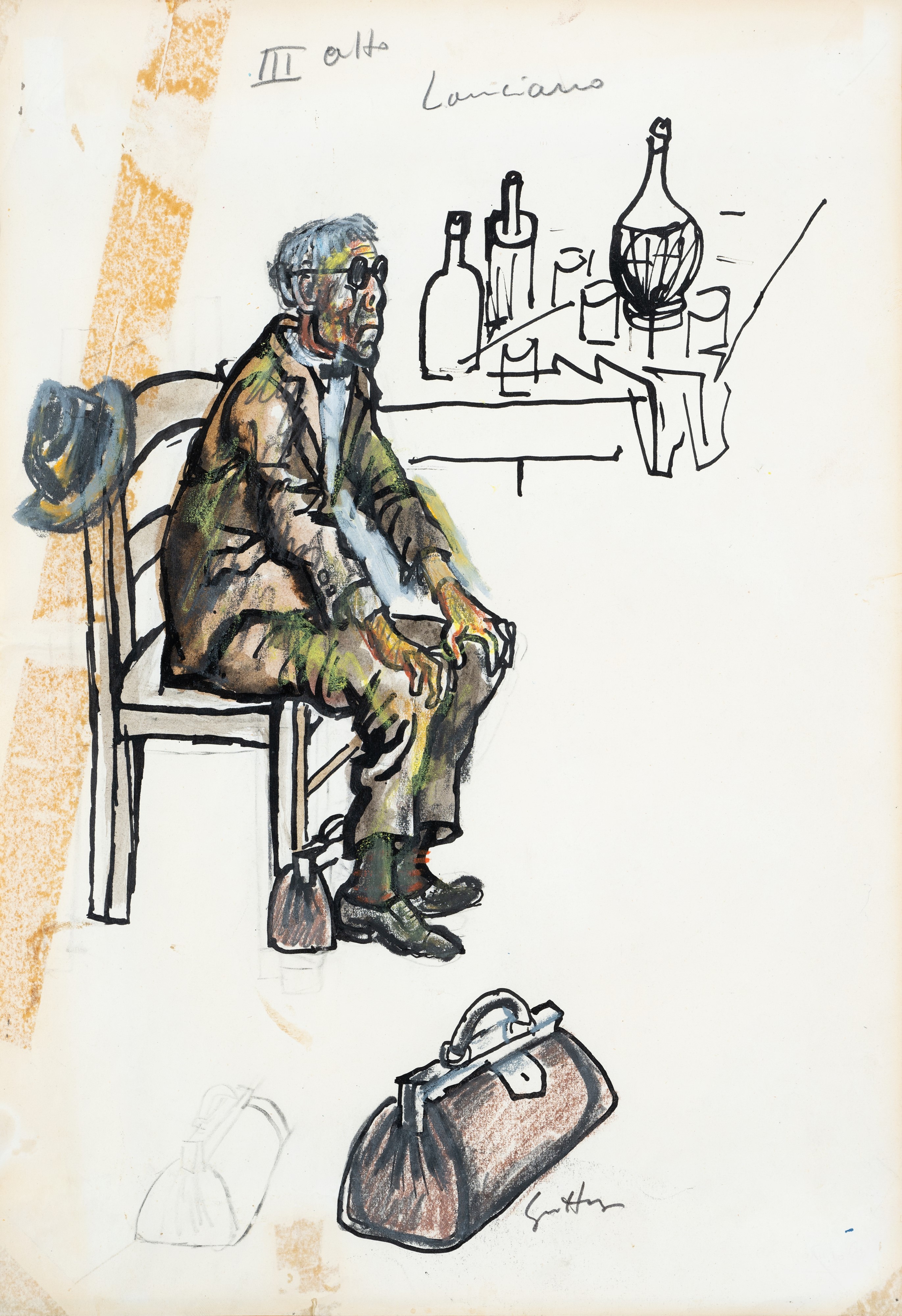 The sketch is part of a group of drawings executed when the artist was commissioned by Eduardo De Filippo to design the sets for the play "Sindaco del Rione Sanità".