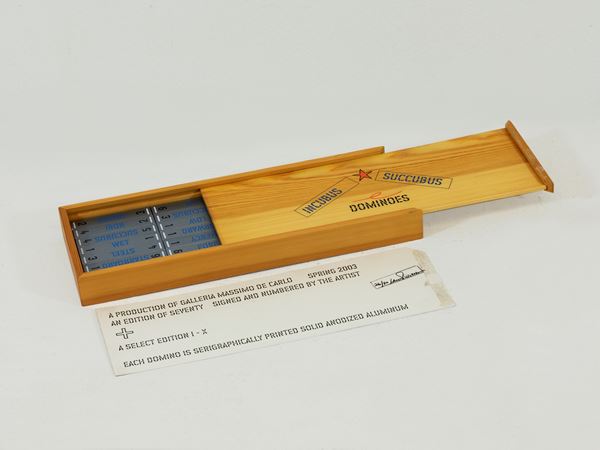 n.28 Domino pieces in silkscreened anodized aluminum contained in a silkscreened fir wood box