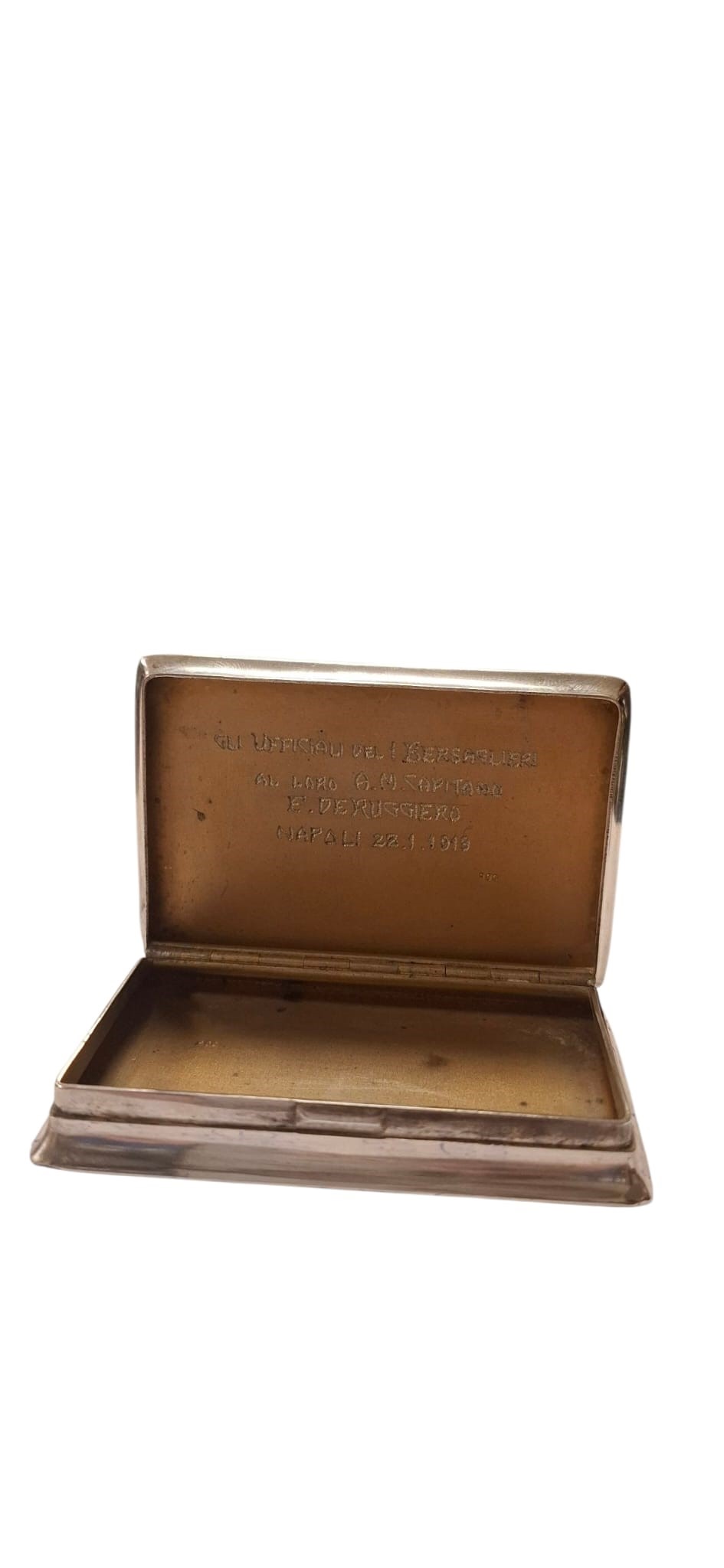 all'interno dedica incisa: "GLI UFFICIALI DEL 1 BERSAGLIERE AL LORO A. M. CAPITANO E. DE RUGGIERO, NAPOLI 28.1.1919"