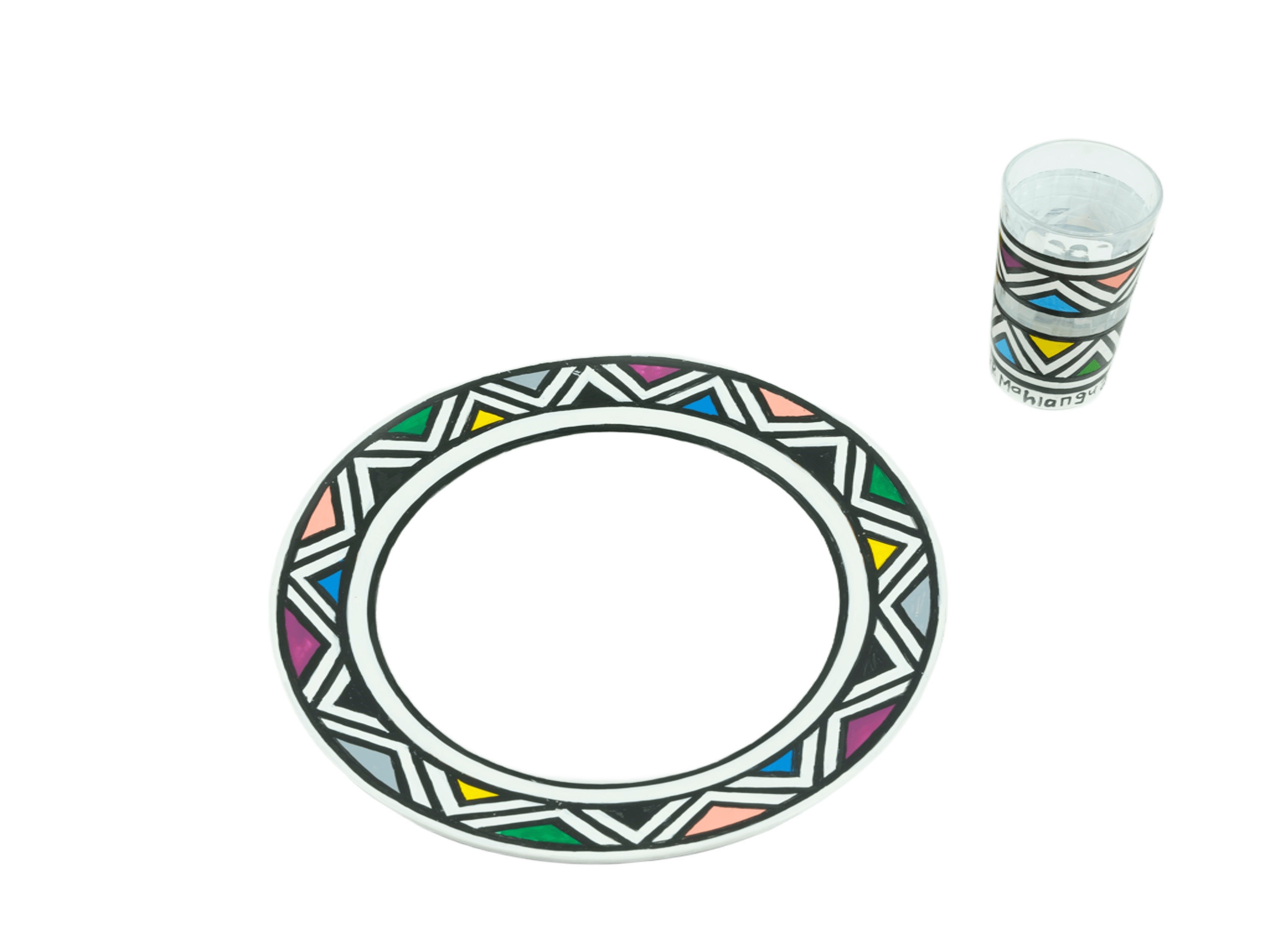 n.1 painted ceramic plate and n.1 painted glass tumbler